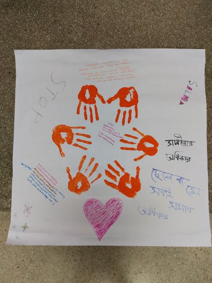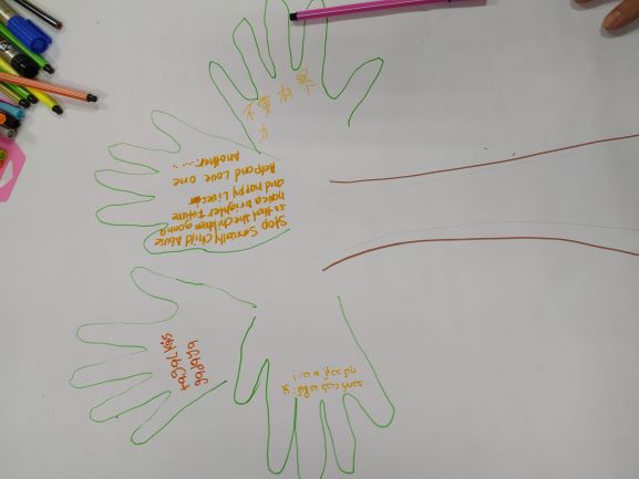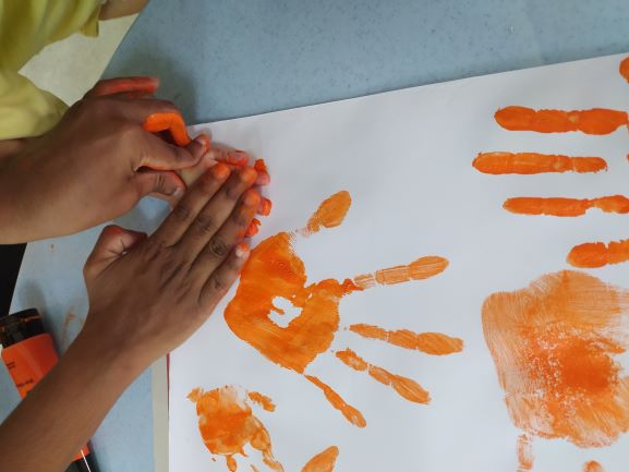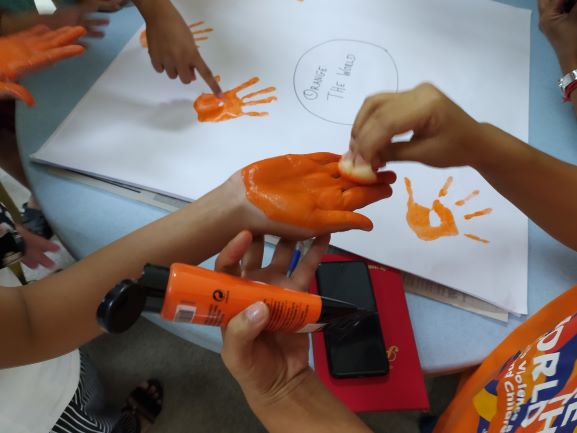 The ‘fun’ activity was painting their hands orange and stamping their palms on a poster to signify their fight against Violence Against Women.