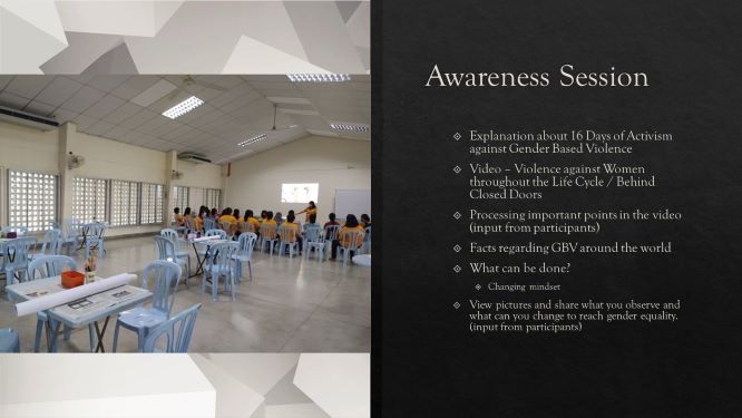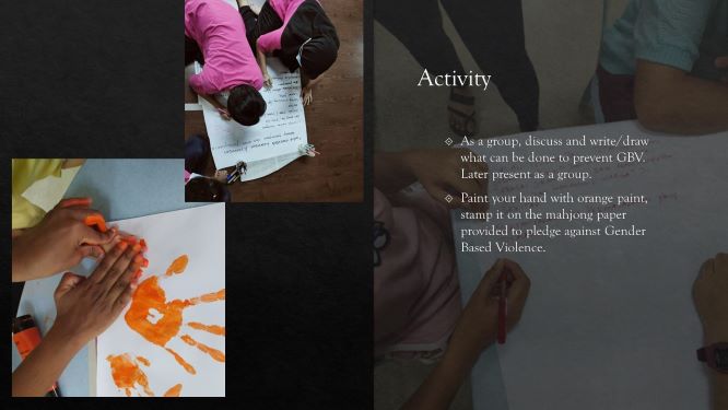 For the adults : video presentations of violence against women, explanations of the different types of abuse – physical, sexual, psychological – were followed by focused discussions on what they have learnt and what can be done moving forward.