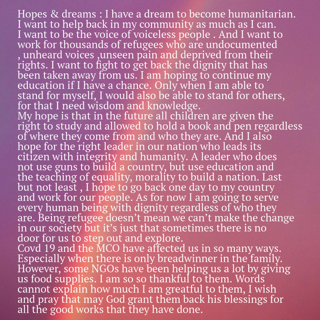 Global Shepherds organized some activities last weekend in conjunction with World Refugee Day. The sessions started with some ice-breaker games, followed by a video presentation. It was geared towards a sharing session, in which participants were encouraged to speak out about their life here in Malaysia – problems faced, how Covid-19 and MCO has affected them, their hopes and dreams.